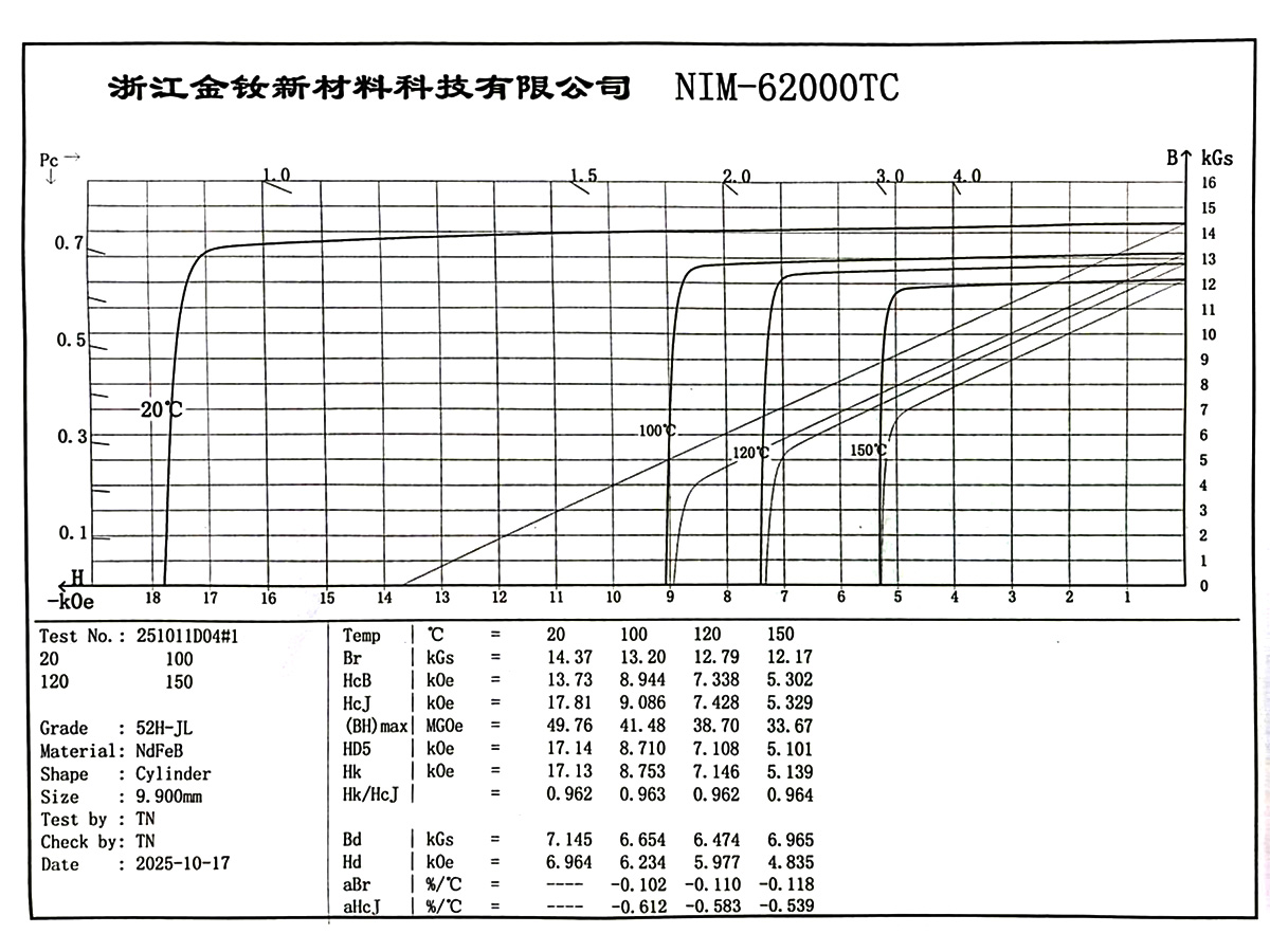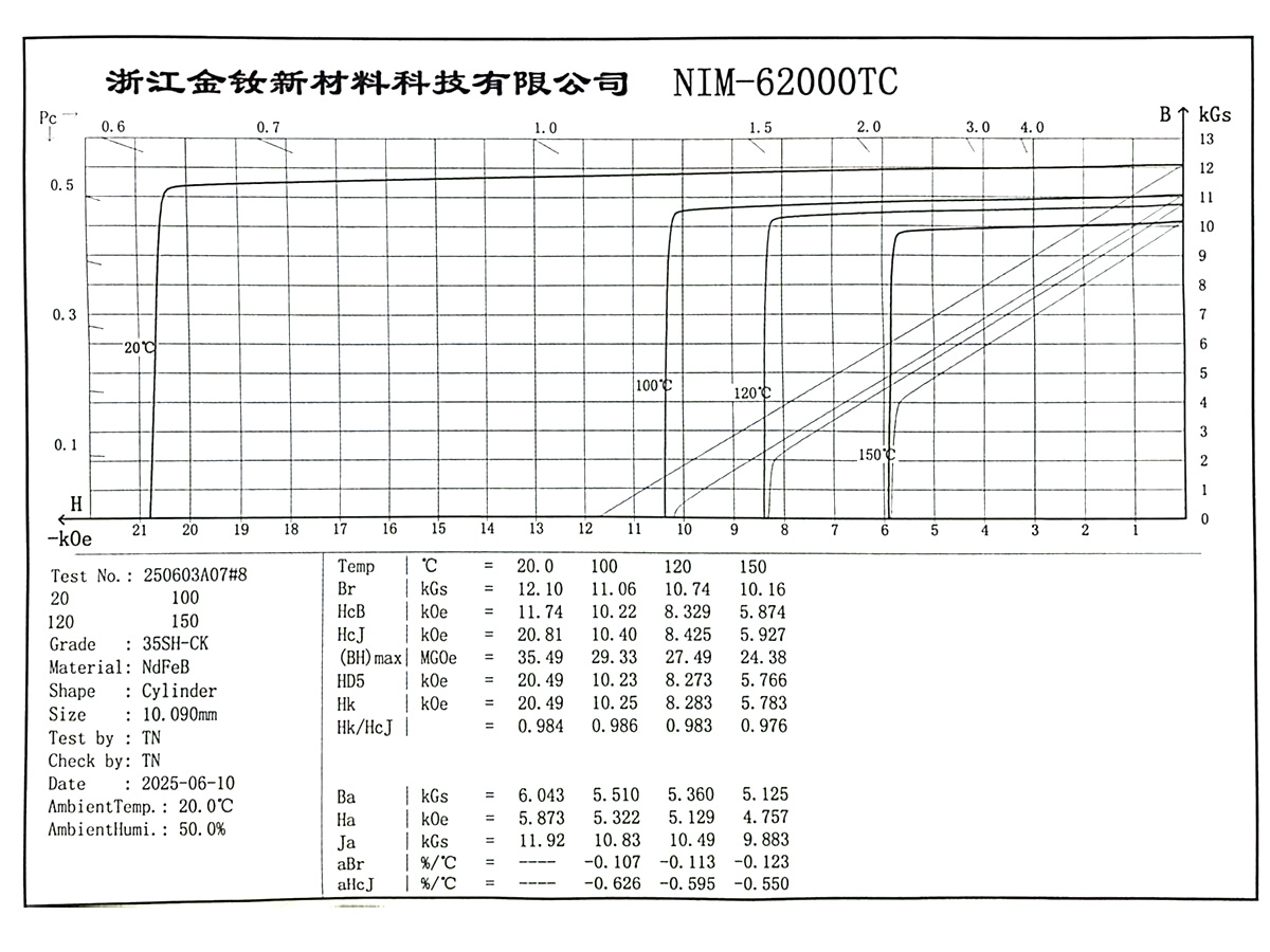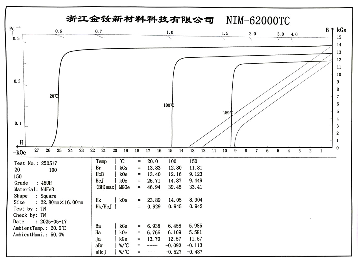 (1) The temperature ranges for calculating the temperature coefficient are divided as follows: H grade and below, ΔT: 20–100°C; SH grade and above, ΔT: 20–150°C. The temperature coefficient is for reference only; for detailed demagnetization curves please contact our sales staff.